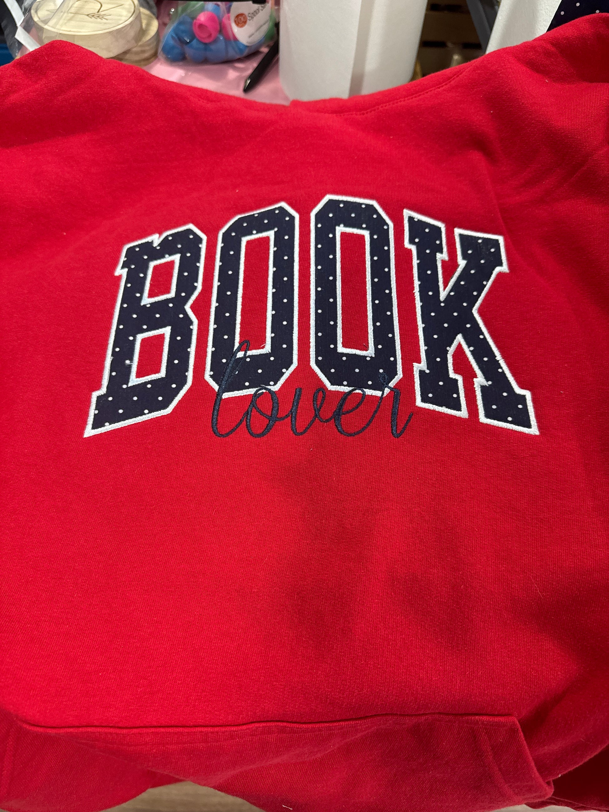 crewneck or hoodie style sweatshirt with appliqué book lover design embroidered on it. stitched on either Comfort Colors or Bella Canvas.