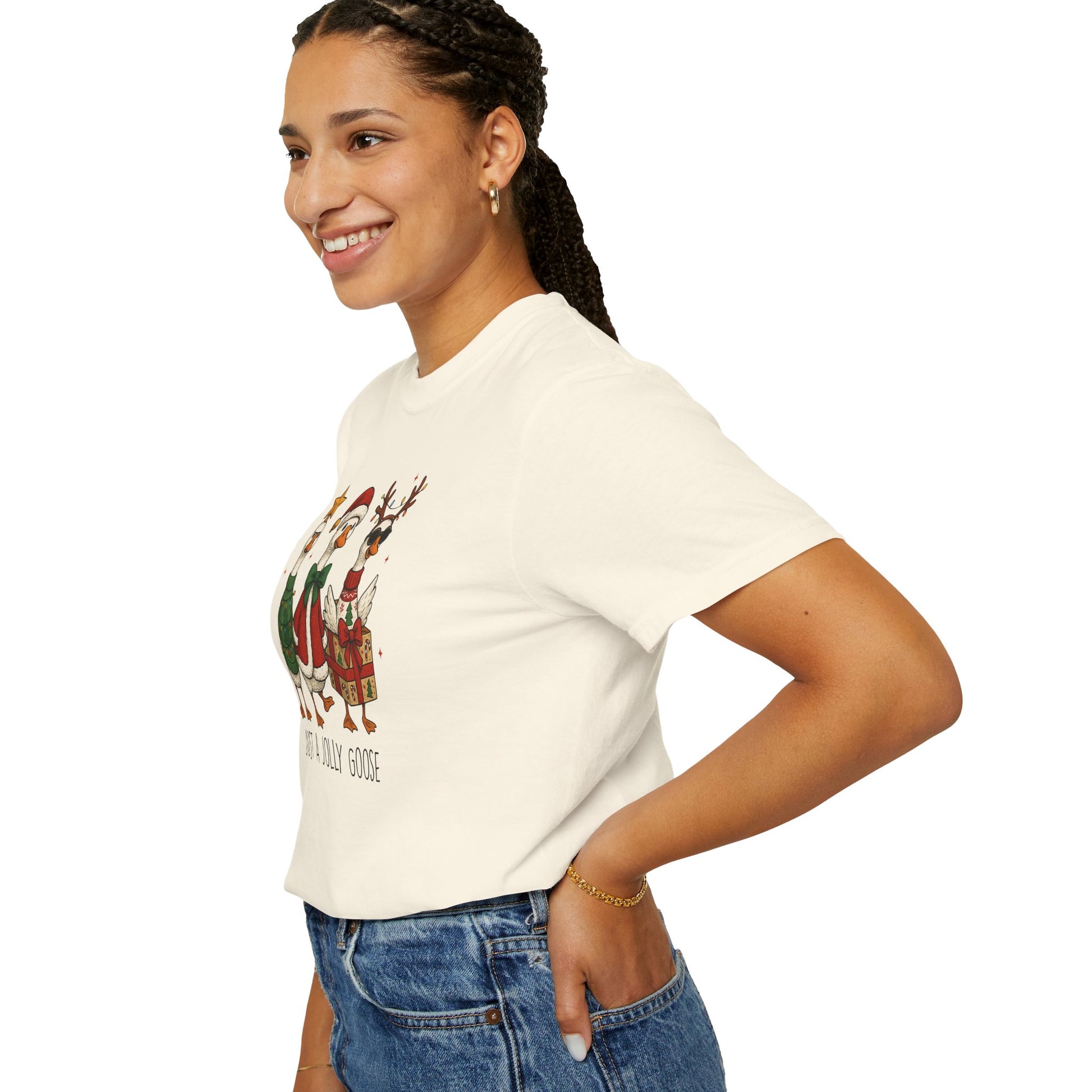 This funny jolly goose Christmas T-shirt is perfect for spreading holiday cheer and laughter. It is a relaxed fit, unisex garment-dyed tee made from 100% ring-spun US cotton, providing long-lasting comfort. Ideal for those who enjoy festive clothing during the holiday season.