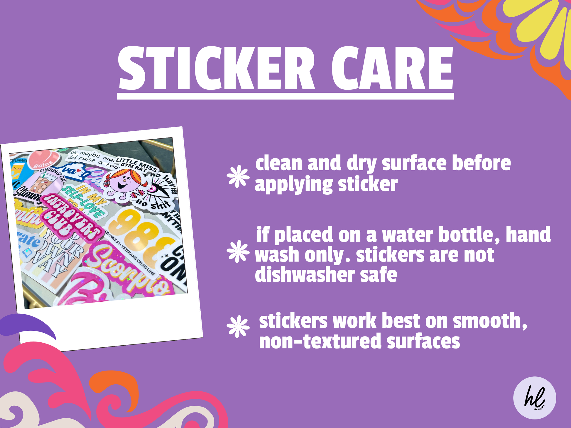 Please note that they are not dishwasher safe, and should not be soaked in water. For water bottles, hand washing is recommended. These stickers will perform best when applied to a clean, smooth surface.
