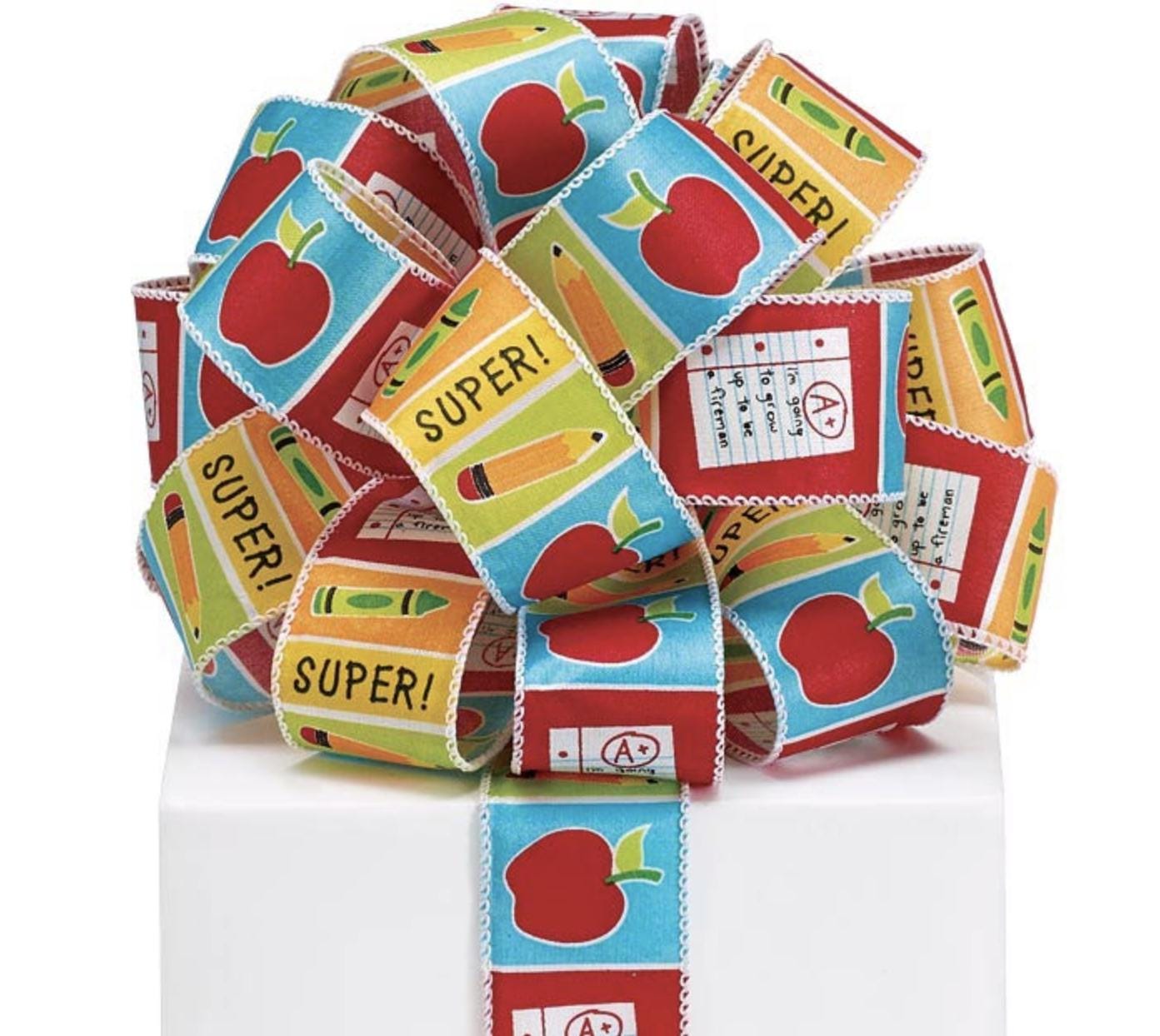 Teacher Ribbon - Wired Satin Fabric with Apples, Pencils, Crayons, and SUPER! - #9 20 Yards