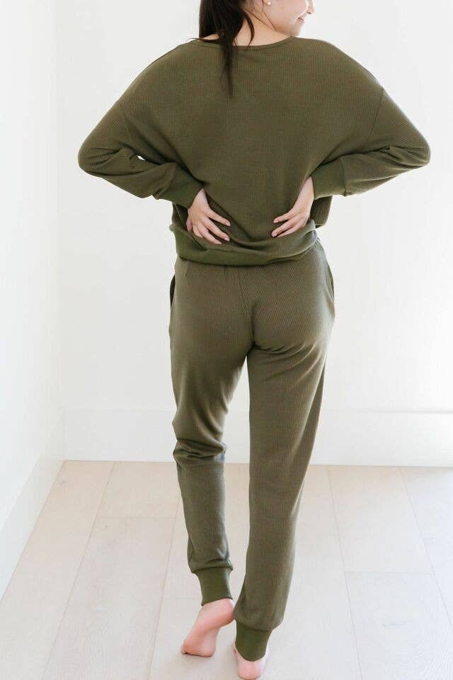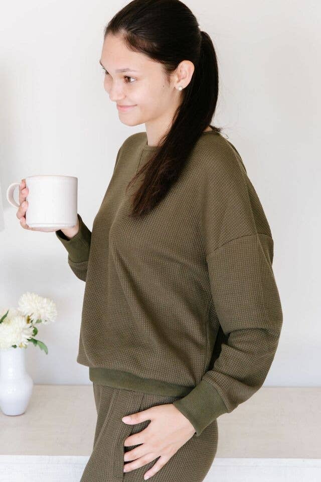 Did somebody say waffle? Listen. Nobody doesn't like waffle fabric. This two piece lounge set features a long sleeve crew neck top, with cuff sleeves, and a long pair of loose tapered pants. Both comfortable and fashionable, you can wear this both at home and around town. You know what we will be wearing this season.